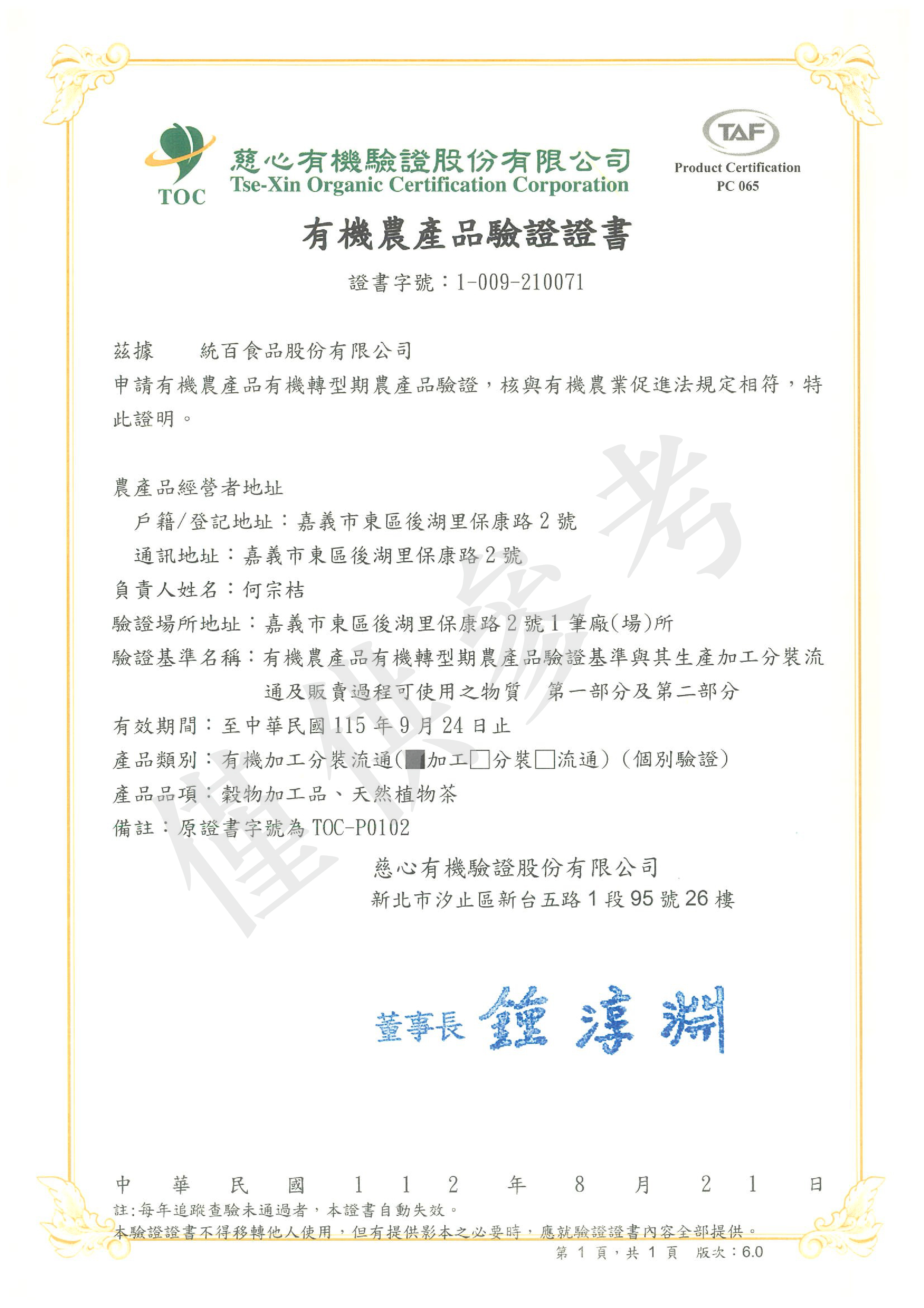 通過 慈心有機農產品加工驗證