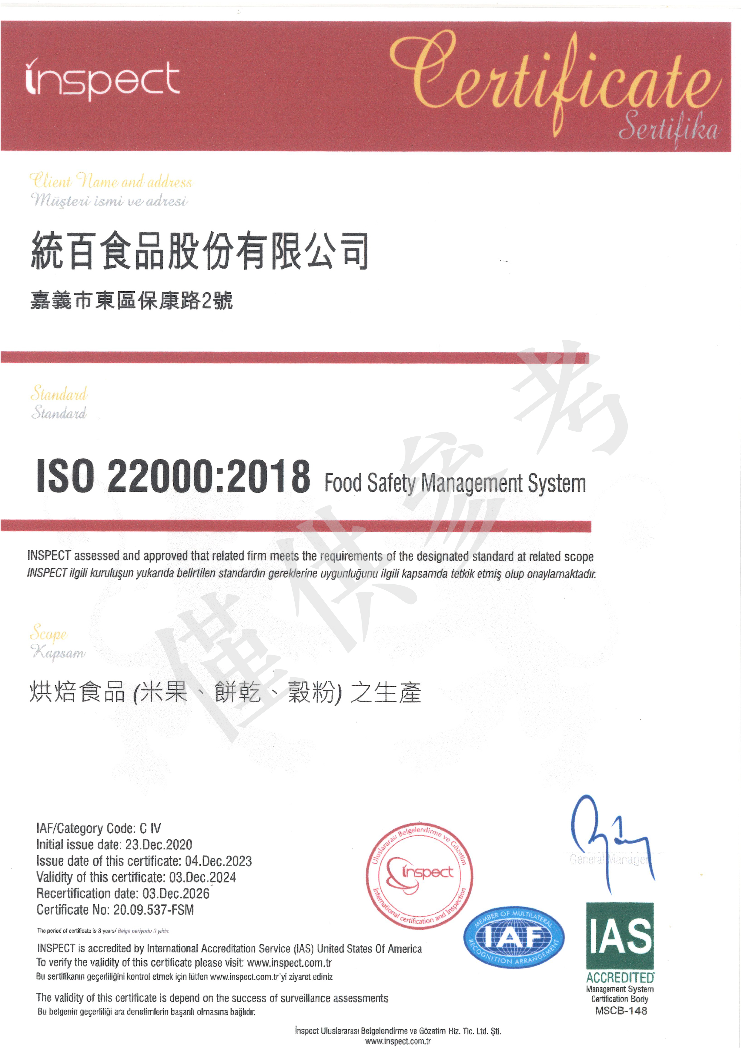 通過 ISO 22000:2018 驗證